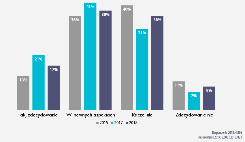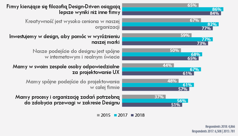 Okazuje się, że pomimo iż wiedza o wpływie kultury Design-Driven na rozwój firmy jest całkiem spora, odsetek organizacji rozwijających się zgodnie z ideą jest względnie niski, choć sukcesywnie rośnie. Jedynie 17% ankietowanych zdecydowanie zgadza się ze stwierdzeniem, że ich firma postępuje zgodnie z kulturą Design-Driven – jest to o 4% więcej w porównaniu z rokiem 2015. Znacznie więcej ankietowanych wskazało, że wprawdzie firma nie opiera całej swojej działalności o Design, jednak w pewnych aspektach postępuje zgodnie z jego filozofią. Szczegółowe dane dotyczące badania na poniższym wykresie: