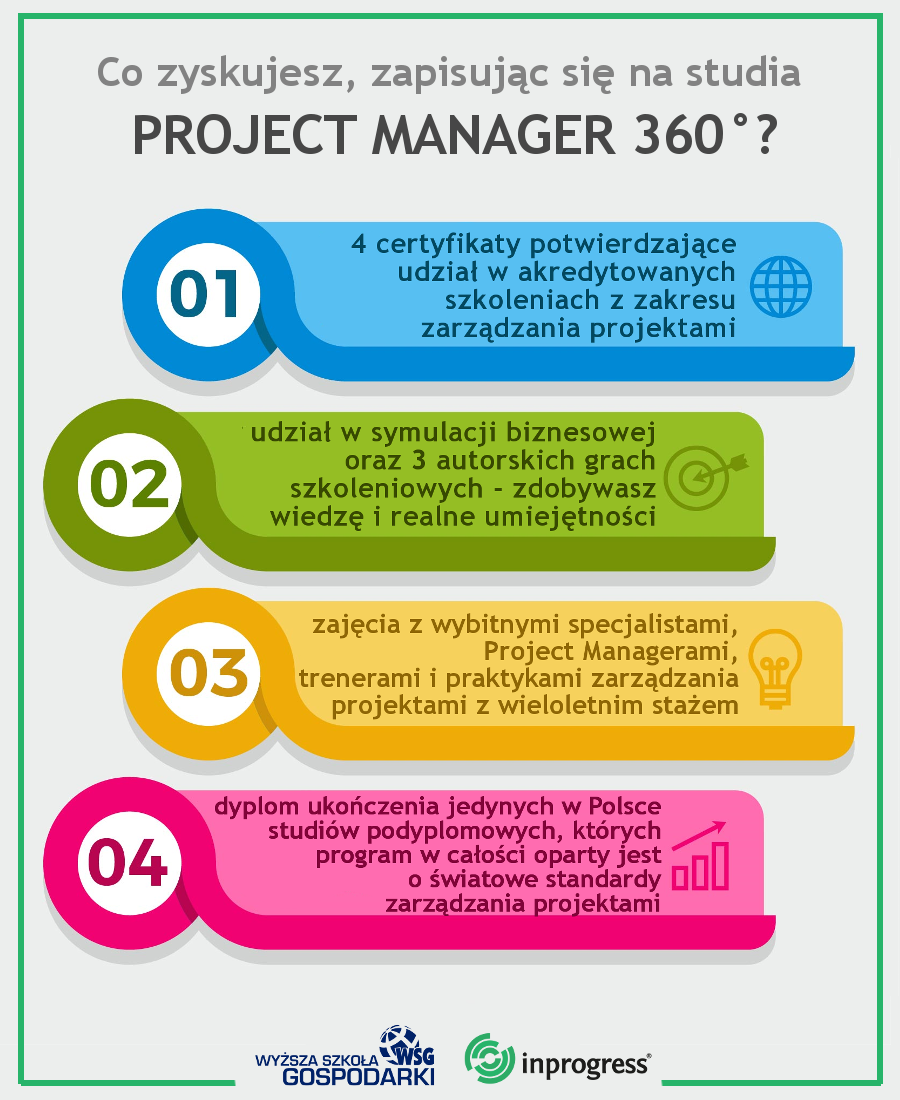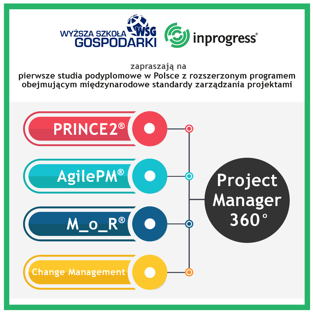 Zapraszamy do wzięcia udziału w jedynych studiach podyplomowych w Polsce, które oparte są wyłącznie o międzynarodowe standardy zarządzania projektami. Studia to wynik współpracy Inprogress oraz Wyższej Szkoły Gospodarki w Bydgoszczy.